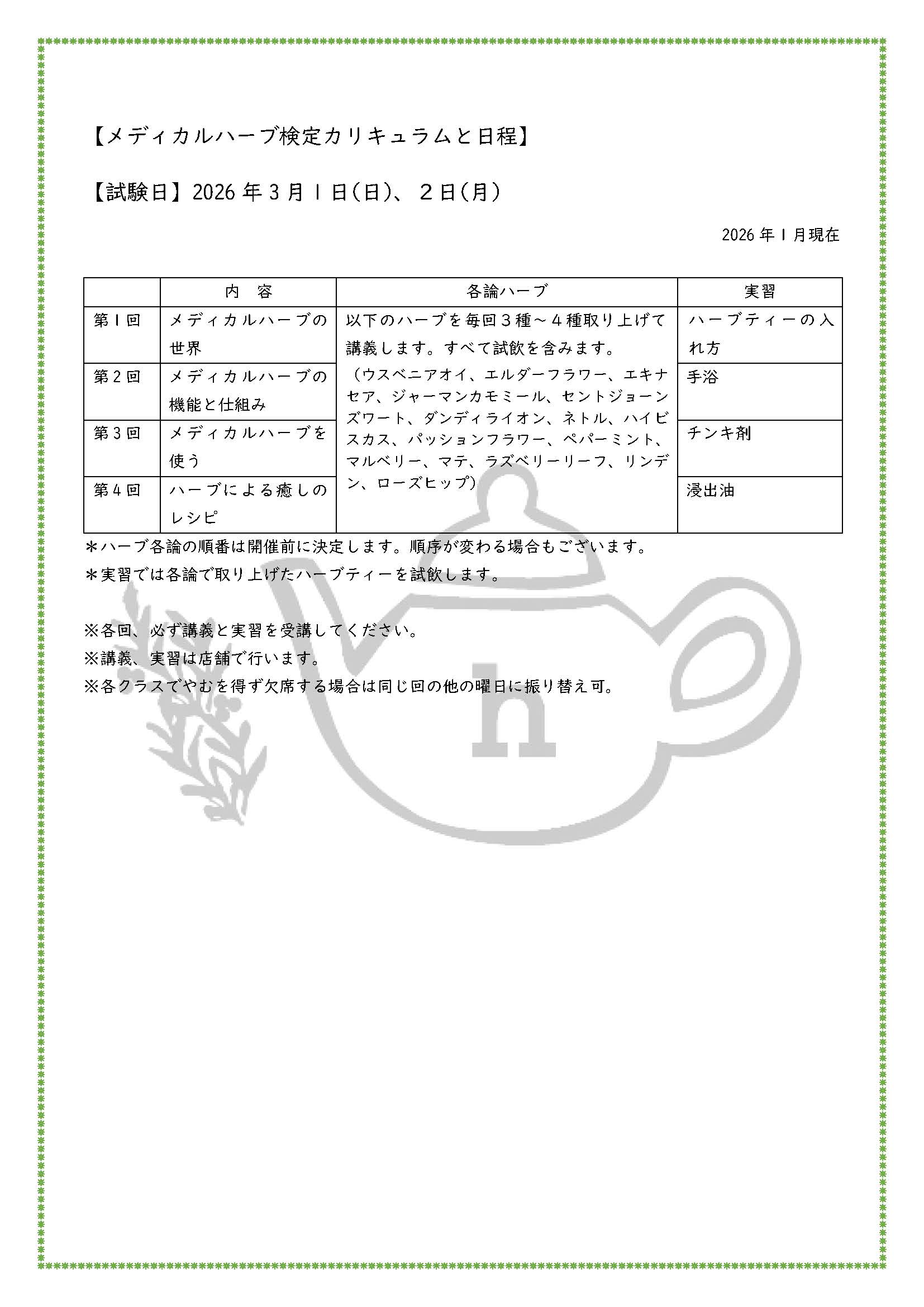 ■メディカルハーブコーディネータ(メディカルハーブ検定)全4単位(1単位約2時間)定員6名